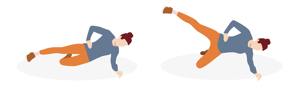 Liike laittaa keskimmäisen pakaralihaksen töihin ja aktivoi kehon sivuketjua. Jos liike tuntuu liian raskaalta, jätä lantion nosto ja lasku pois. Pysy siis kylkilankussa kyynärnojassa ja tee ylemmän jalan loitonnus samalla, kun alempi jalka pysyy lattiassa.