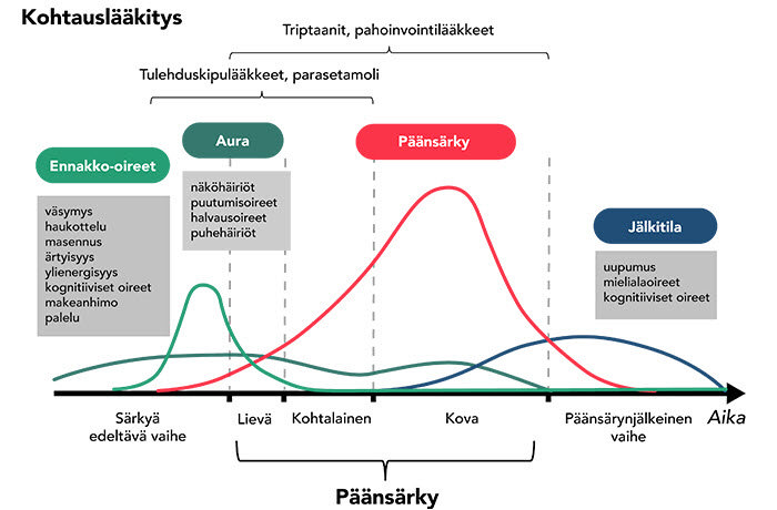 Kuva 1. Migreenin oirejatkumo ja kohtauslääkkeet. 01, 04
