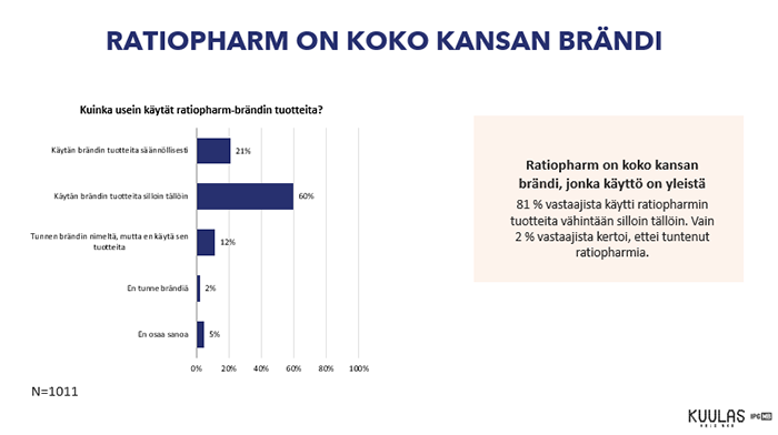 • ratiopharm-tuotemerkin tunnettuus on korkea. Sen tuntee 93 % terveydestä ja hyvinvoinnista kiinnostuneista suomalaisista. ratiopharm-tuotteita on heistä käyttänyt yli 80 %.