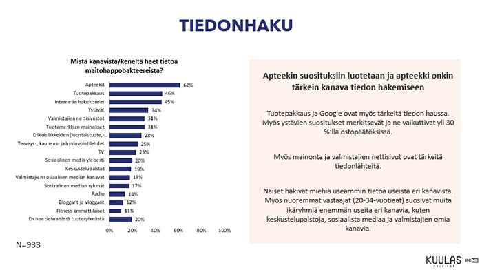 Apteekit ovat kuluttajille ylivoimaisesti tärkein paikka hakea tietoa lääkkeistä ja itsehoitovalmisteista. Apteekit korostuvat eniten tiedonhakukanavana tuotekategoriasta riippumatta.