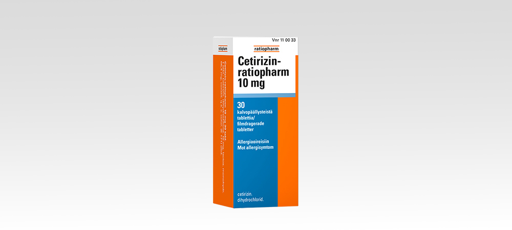 Cetirizin-ratiopharm 10 mg on allergialääke, joka on tarkoitettu kausiluonteiseen ja ympärivuotiseen allergiseen nuhaan liittyvien nenä- ja silmäoireiden sekä nokkosihottuman hoitoon. Sen vaikuttava aine setiritsiini on antihistamiini.