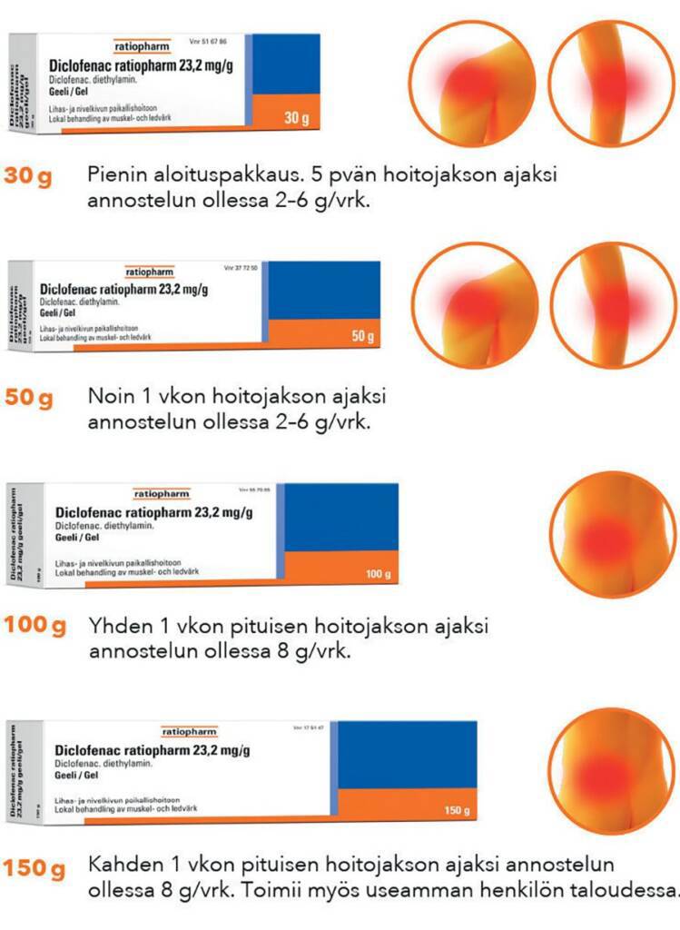 Diclofenac ratiopharm 23,2 mg/g geeli on tarkoitettu kivun paikalliseen, oireenmukaiseen hoitoon nyrjähdyksissä ja venähdyksissä. Annostelu vain 2 kertaa päivässä. Aikuisille ja yli 14-vuotiaille lapsille. Itsehoitolääke apteekista ilman reseptiä.